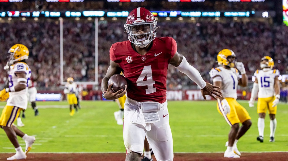 Jalen Milroe went 15-for-23 for 219 yards, but he ran for 155 yards on 20 carries (he was sacked twice for a loss of 12), scoring four touchdowns on the ground. Jase McClellan also scored.